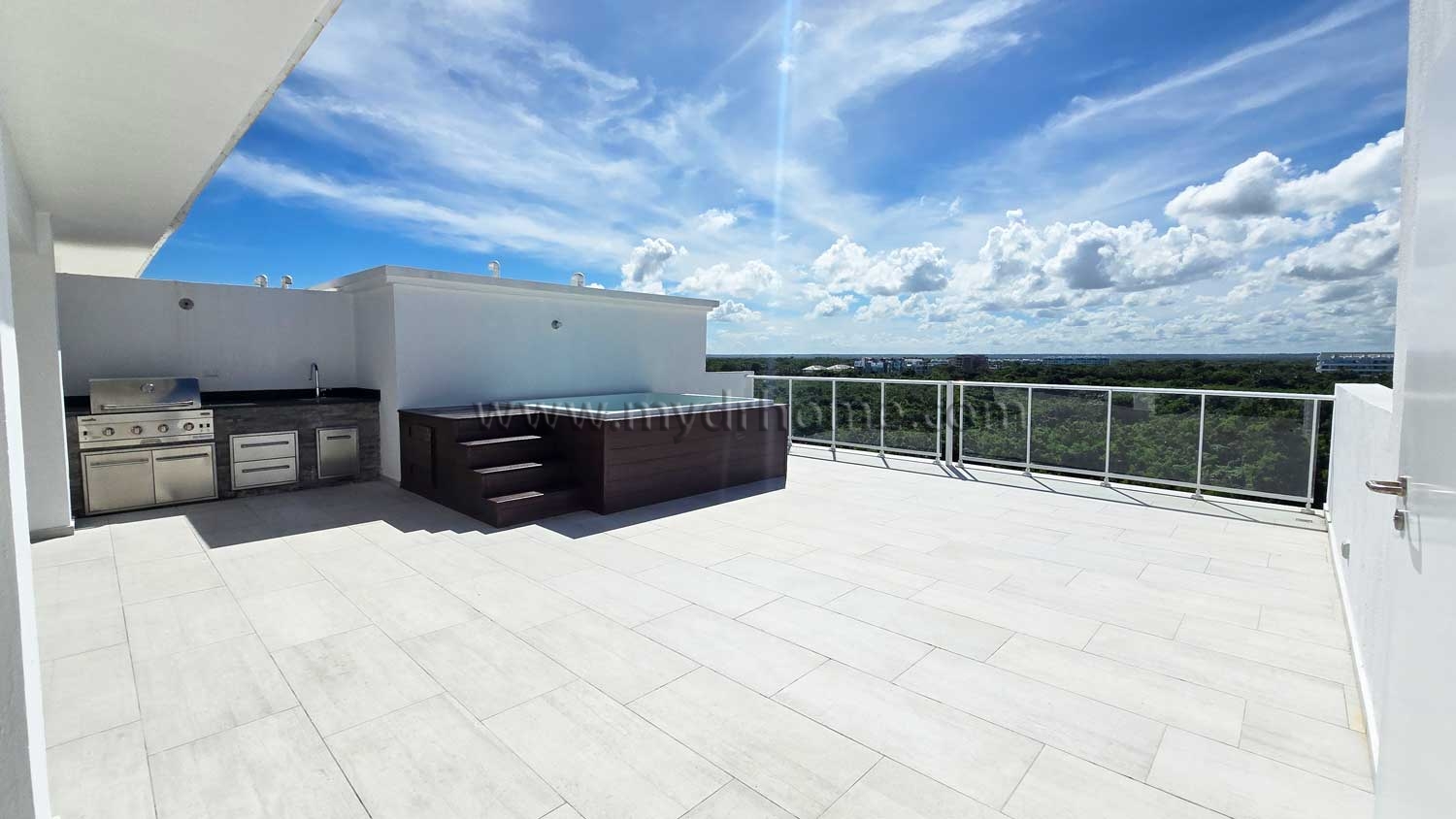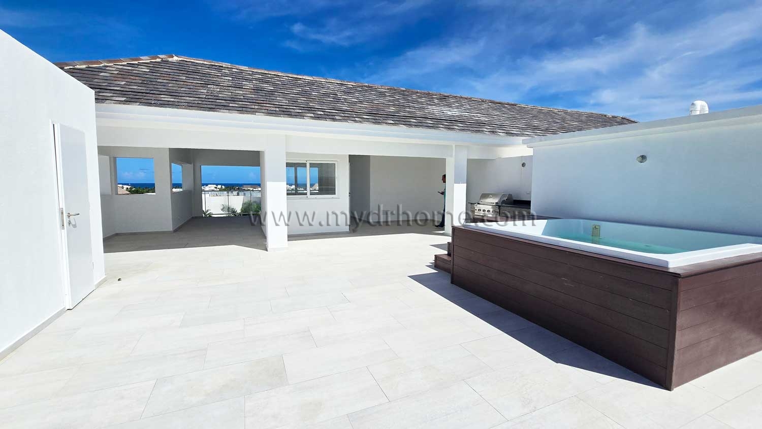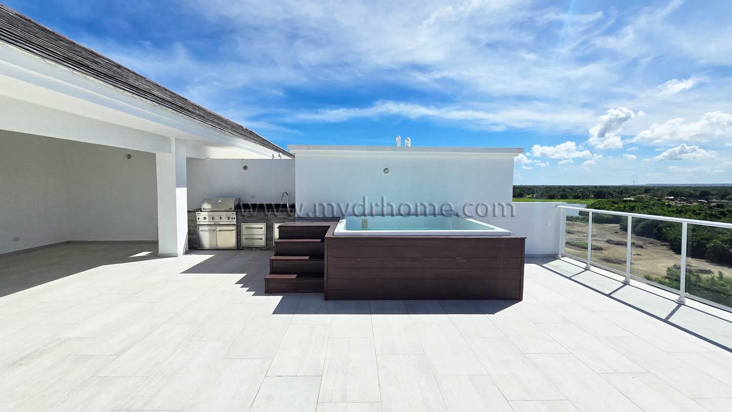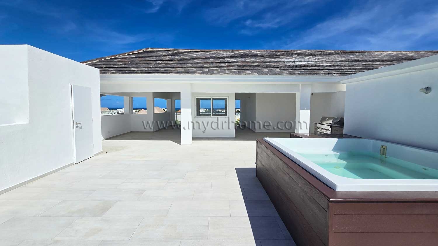 The highlight of the property is the impressive rooftop terrace on the second level. This expansive outdoor space is designed for relaxation and entertainment. It features a private jacuzzi, a barbecue area, and a guest bathroom. From here, you can enjoy stunning views of the golf course and even partial ocean views from the opposite side. It is the perfect setting for sunsets, gatherings, or peaceful evenings.
