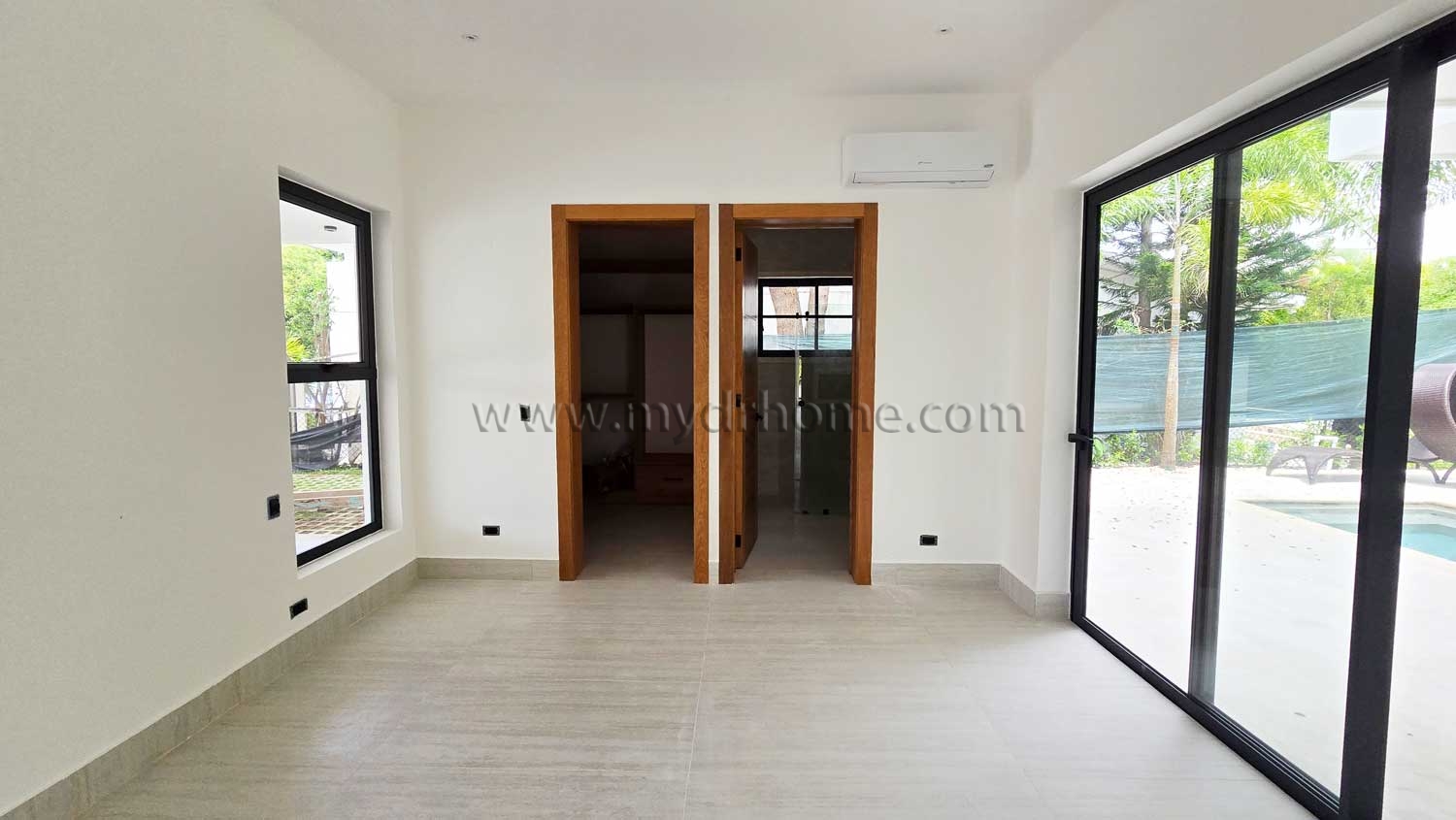 A guest bedroom on the ground floor ensures convenience. It includes a private bathroom and a walk-in closet. The service area is discreet and practical, with its own bathroom.